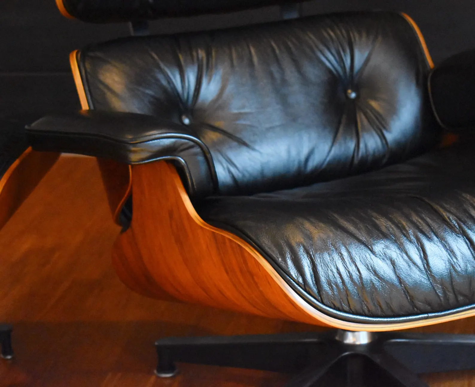 This pairing is of the third-generation model of the lounger from the early 70s. The original black leather cushions in excellent shape with very little wearing signs. The rosewood has been reconditioned to restore their vibrancy, metal bases and accents have been buffed and polished. Feet, sliders and bases are firm with no wobbling. metal feet/sliders (i.e. Domes of Silence) are in-tact and base pedestal bushings are sturdy/solid (ie. no wobbles).
