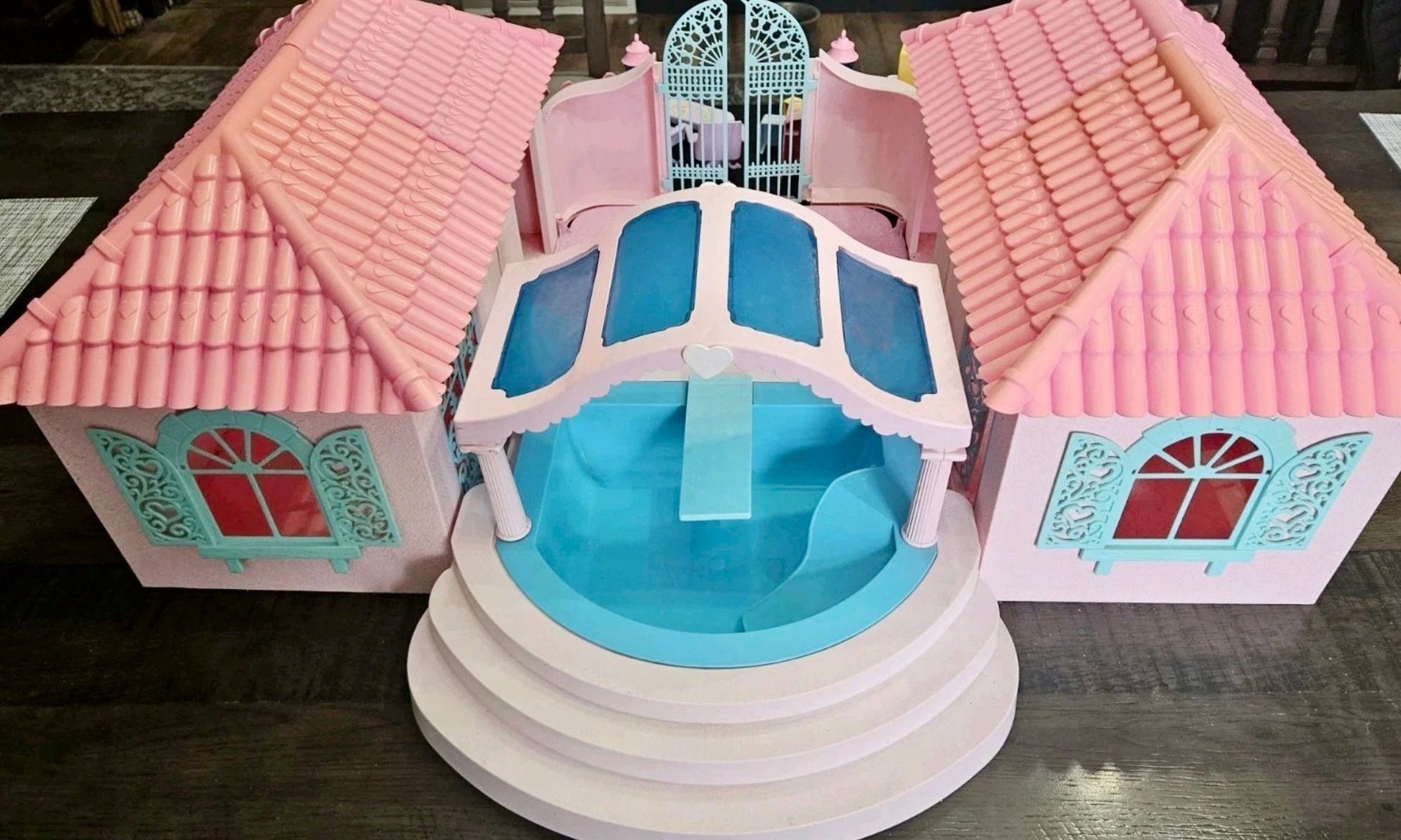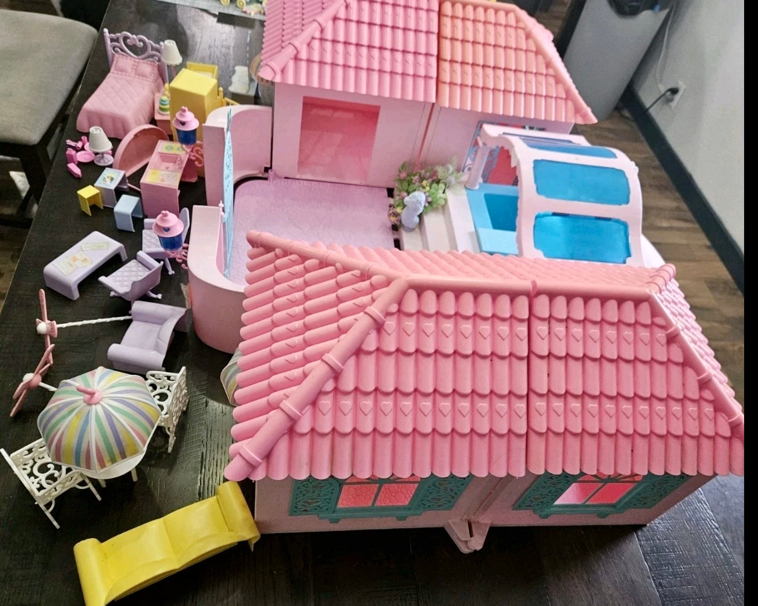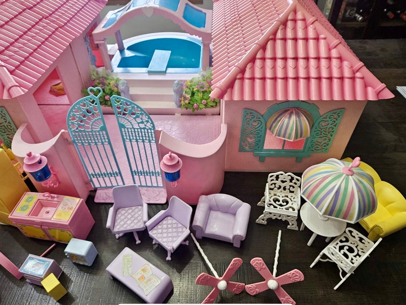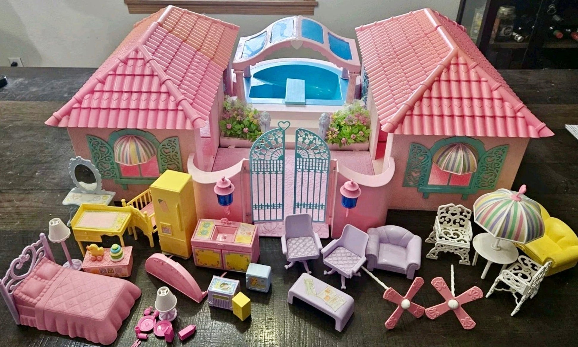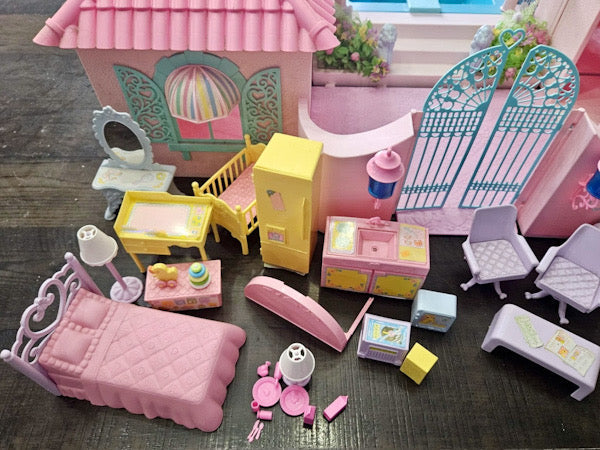 This is a gorgeous, 98% completed 'PARADISE ESTATE', a HASBRO play set for 'My Little Pony' in 1986. It comes with the original box. The house pieces are in great shape; one roof piece has a slight pigment difference due to age, but none have any cracks/chips/stains. All accessories shown are included, including all flowers, furniture, canopy, canopy-skylights, heart-accents, windows, gates, and doors.