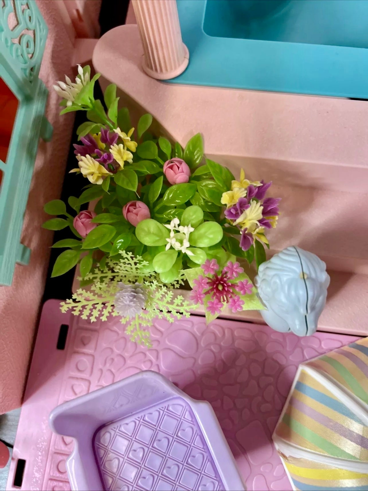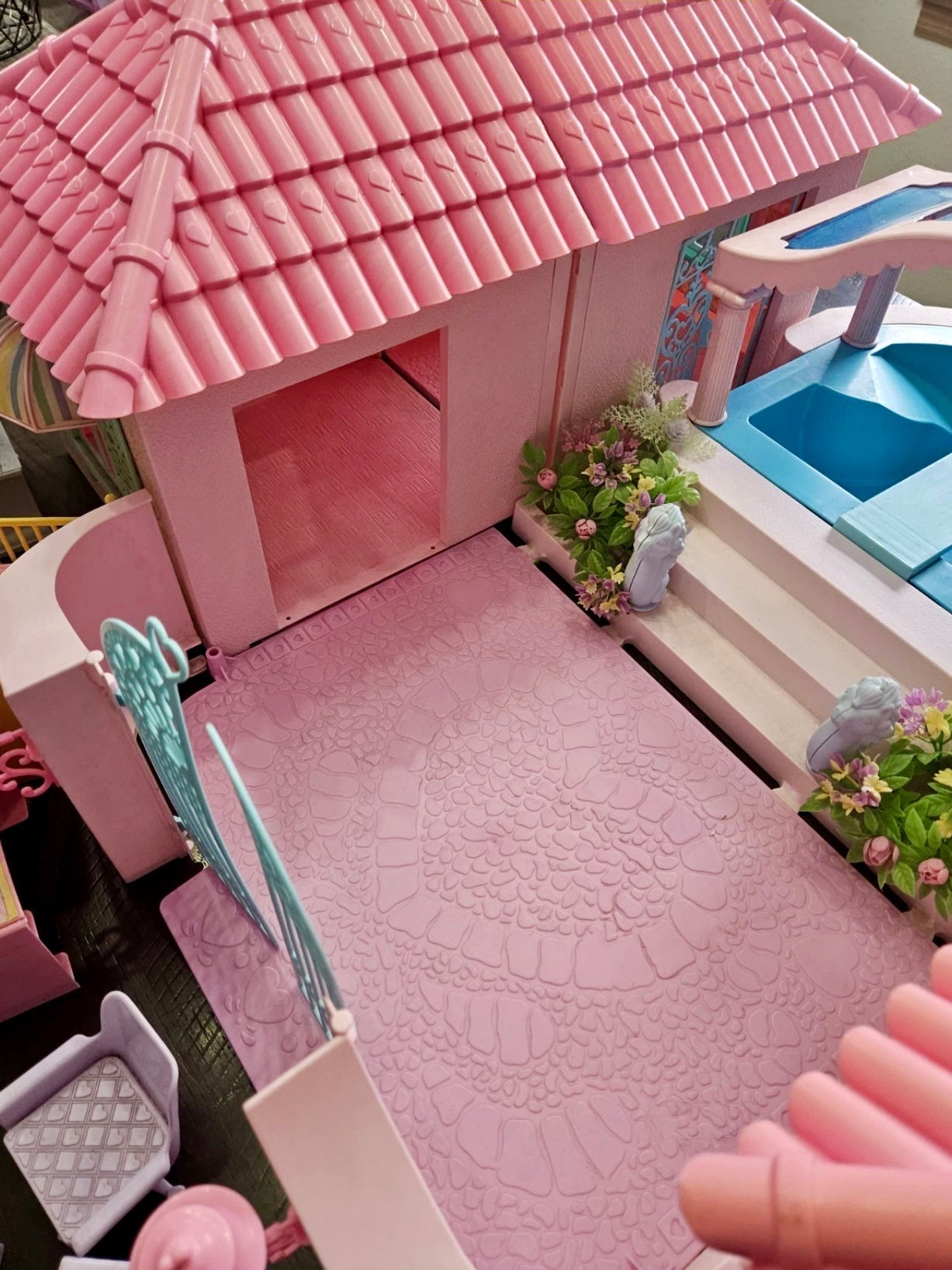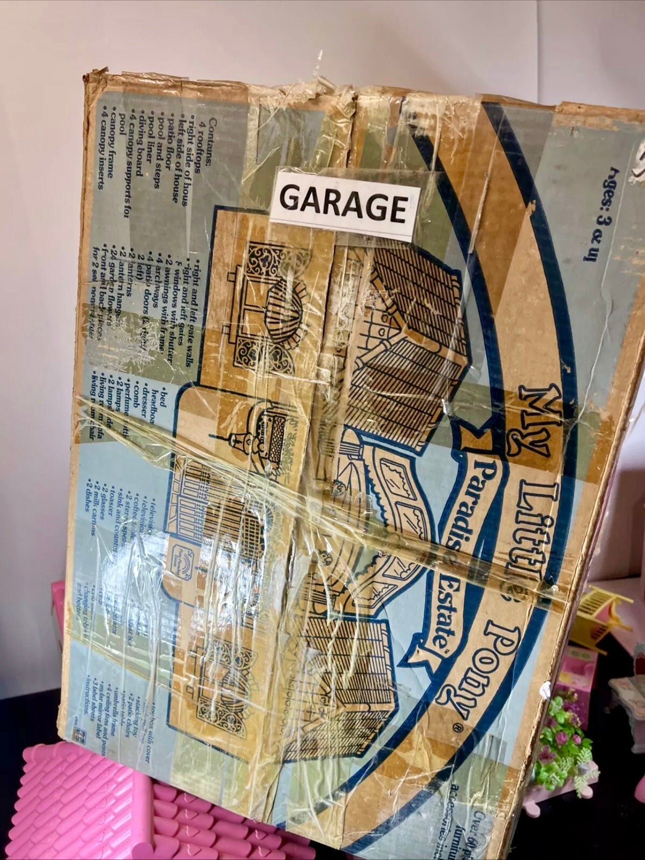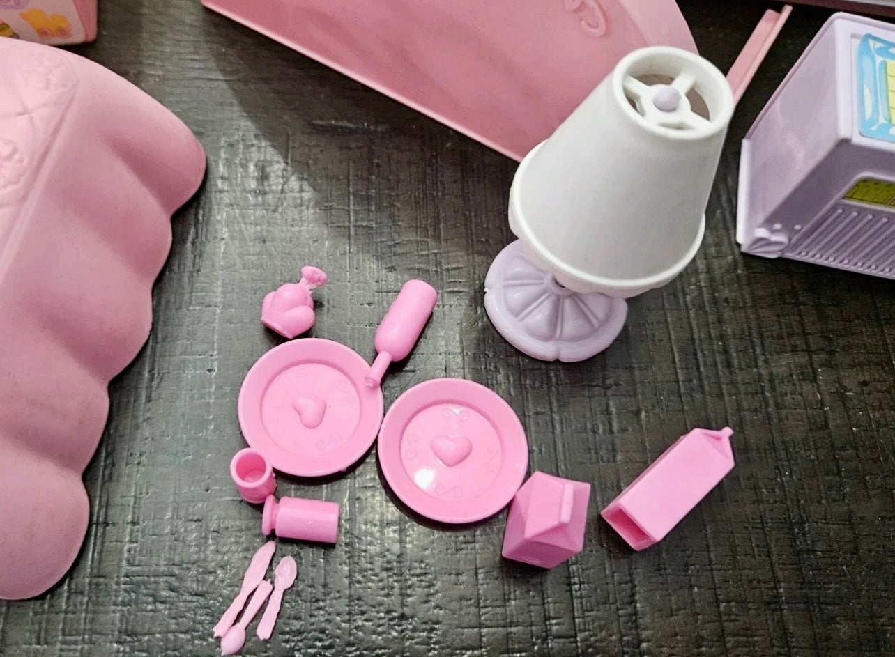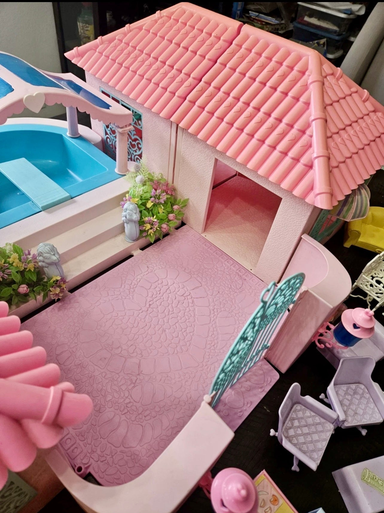 This is a gorgeous, 98% completed 'PARADISE ESTATE', a HASBRO play set for 'My Little Pony' in 1986. It comes with the original box. The house pieces are in great shape; one roof piece has a slight pigment difference due to age, but none have any cracks/chips/stains. All accessories shown are included, including all flowers, furniture, canopy, canopy-skylights, heart-accents, windows, gates, and doors.