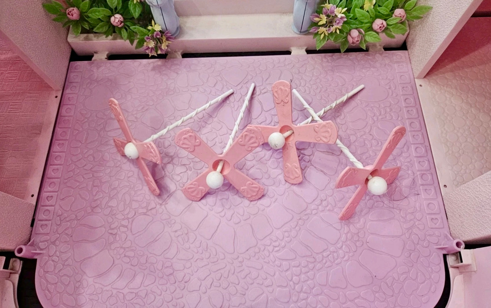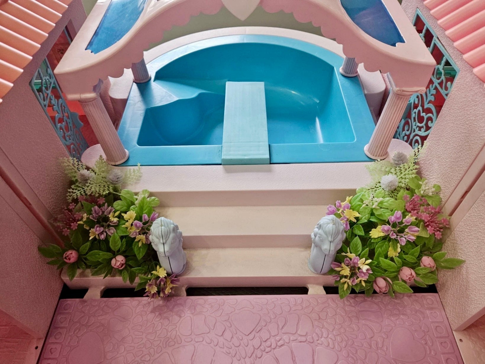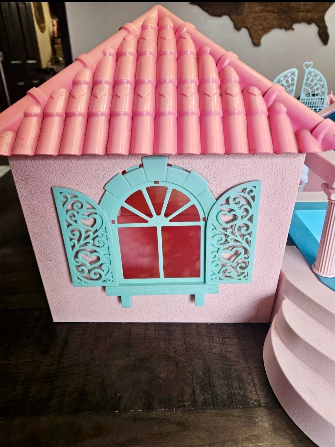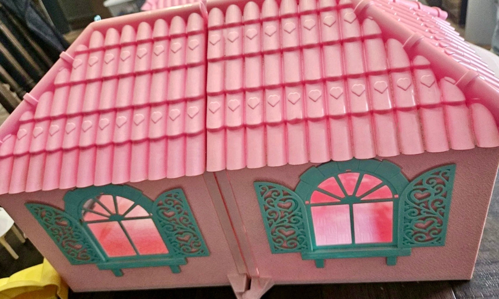 This is a gorgeous, 98% completed 'PARADISE ESTATE', a HASBRO play set for 'My Little Pony' in 1986. It comes with the original box. The house pieces are in great shape; one roof piece has a slight pigment difference due to age, but none have any cracks/chips/stains. All accessories shown are included, including all flowers, furniture, canopy, canopy-skylights, heart-accents, windows, gates, and doors.