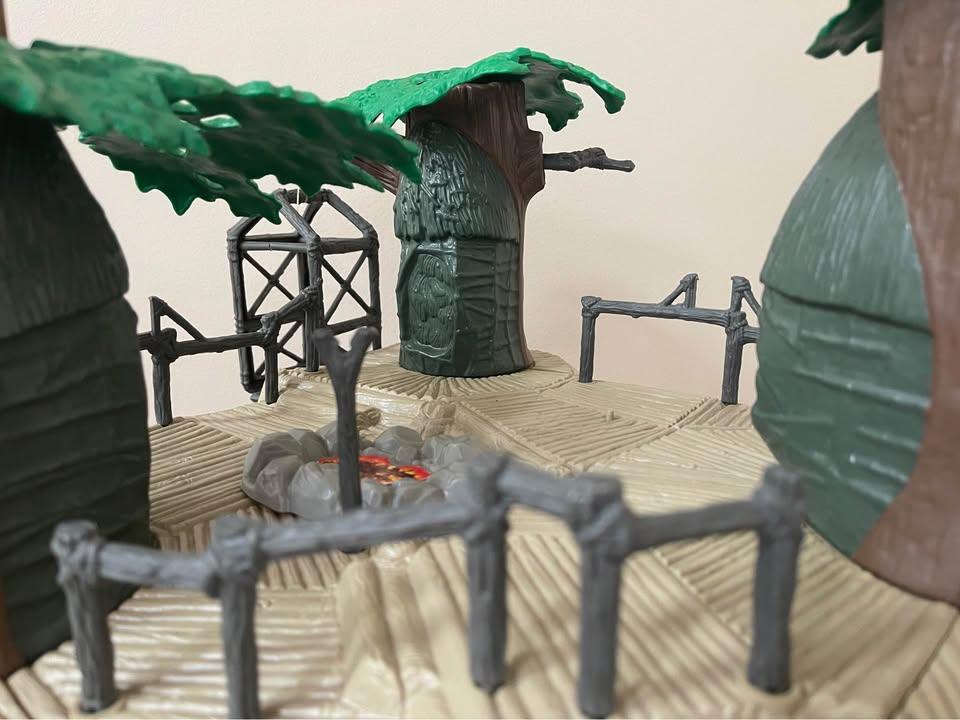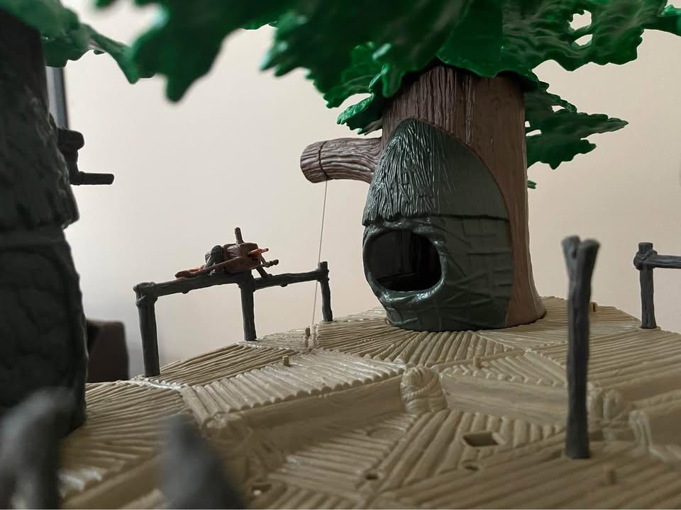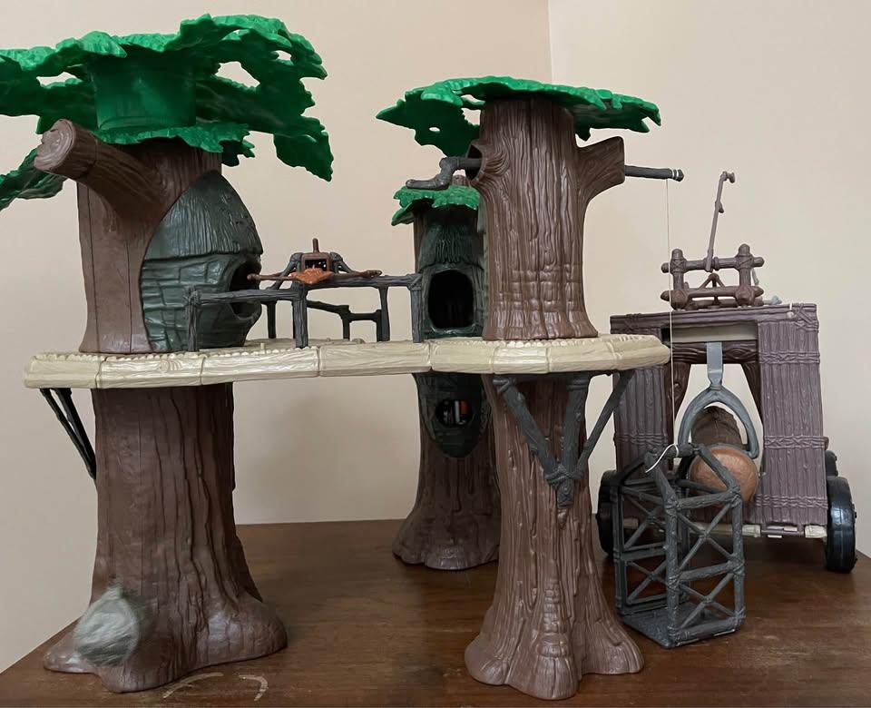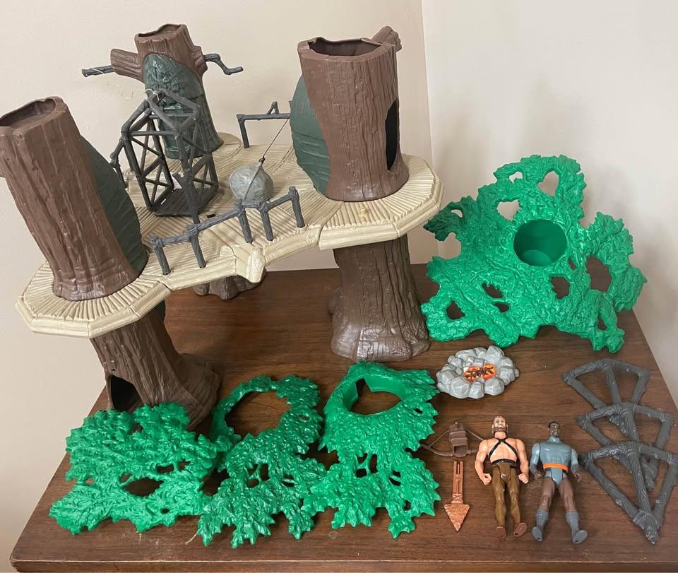 In front of your eyes you'll find an excellent conditioned 1991 SHERWOOD FORREST play set by KENNER TOYS from 1991. KENNER recycled the molds for the older Star Wars EWOK VILLAGE play set earlier that decade. Play set comes with the Battle Wagon. Both are from the 'Robin Hood: Prince of Thieves' universe.
