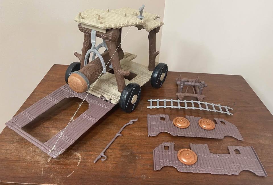 Both play sets include all original accessories with the following exceptions: Sherwood Forest is missing the trap-net and roasting stick; the second arrow holder is absent (arrowhead included). The Battle Wagon is missing the catapult boulders and gray stump seat. Both sets are clean and intact, with minor white spots present on some Sherwood Forest tree pieces. There are three action figure included in this lot; Robin Hood, Little John, And Azeem